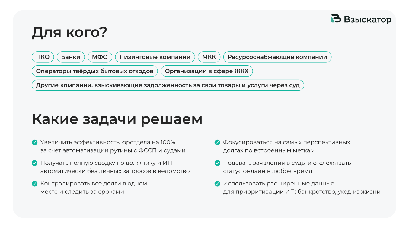 Сервис работы с Федеральной службой судебных приставов посредством Единого портала государственных услуг (ЕПГУ) в части отправки заявлений, получения результатов оказания услуг и полного контроля хода исполнительных производств. Использование сервиса повышает сбор задолженности в 2 раза.